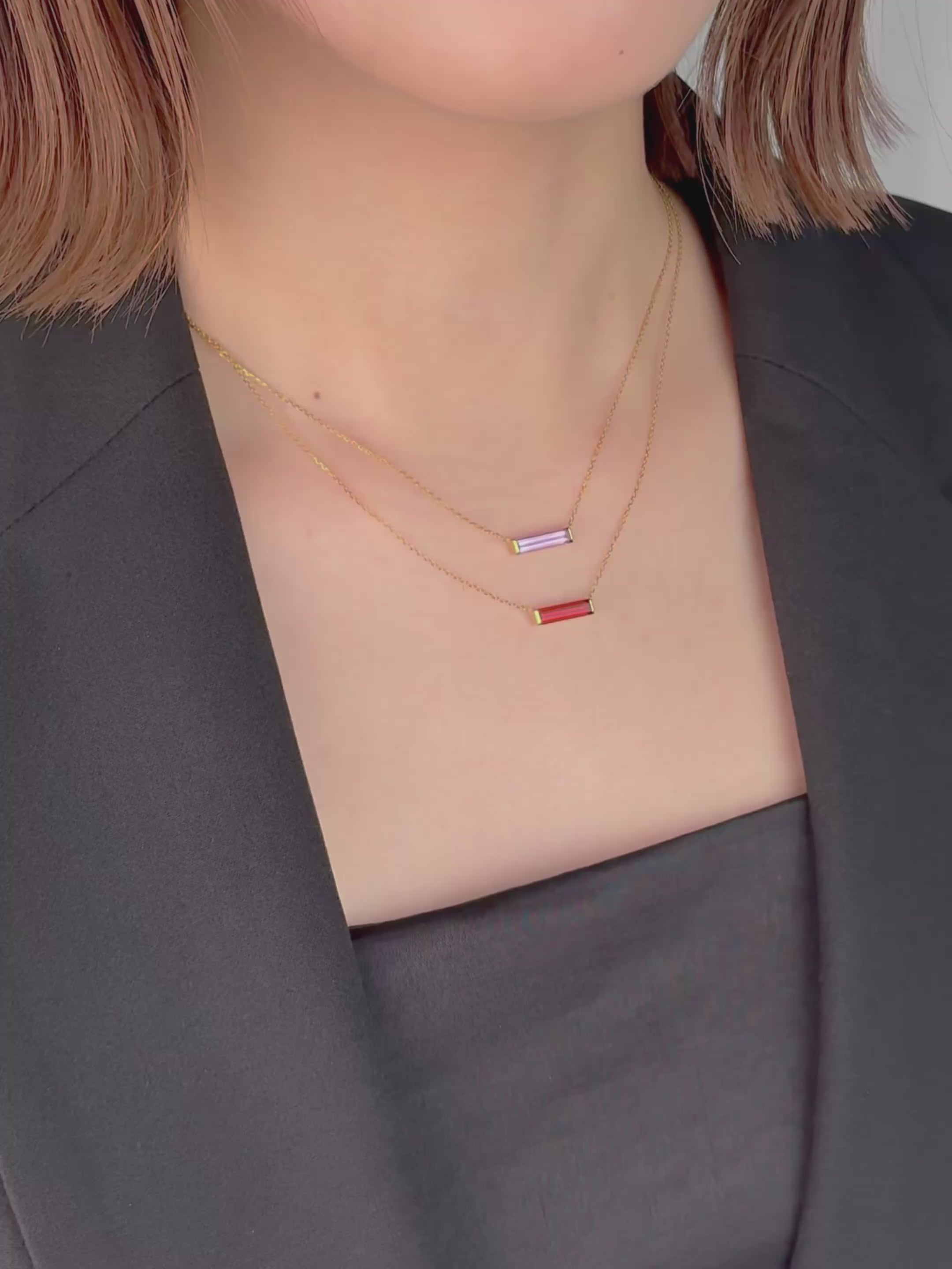 水平にセッティングしたアメジストが胸元でさりげなく映え、装いに奥行きを添えるネックレス。