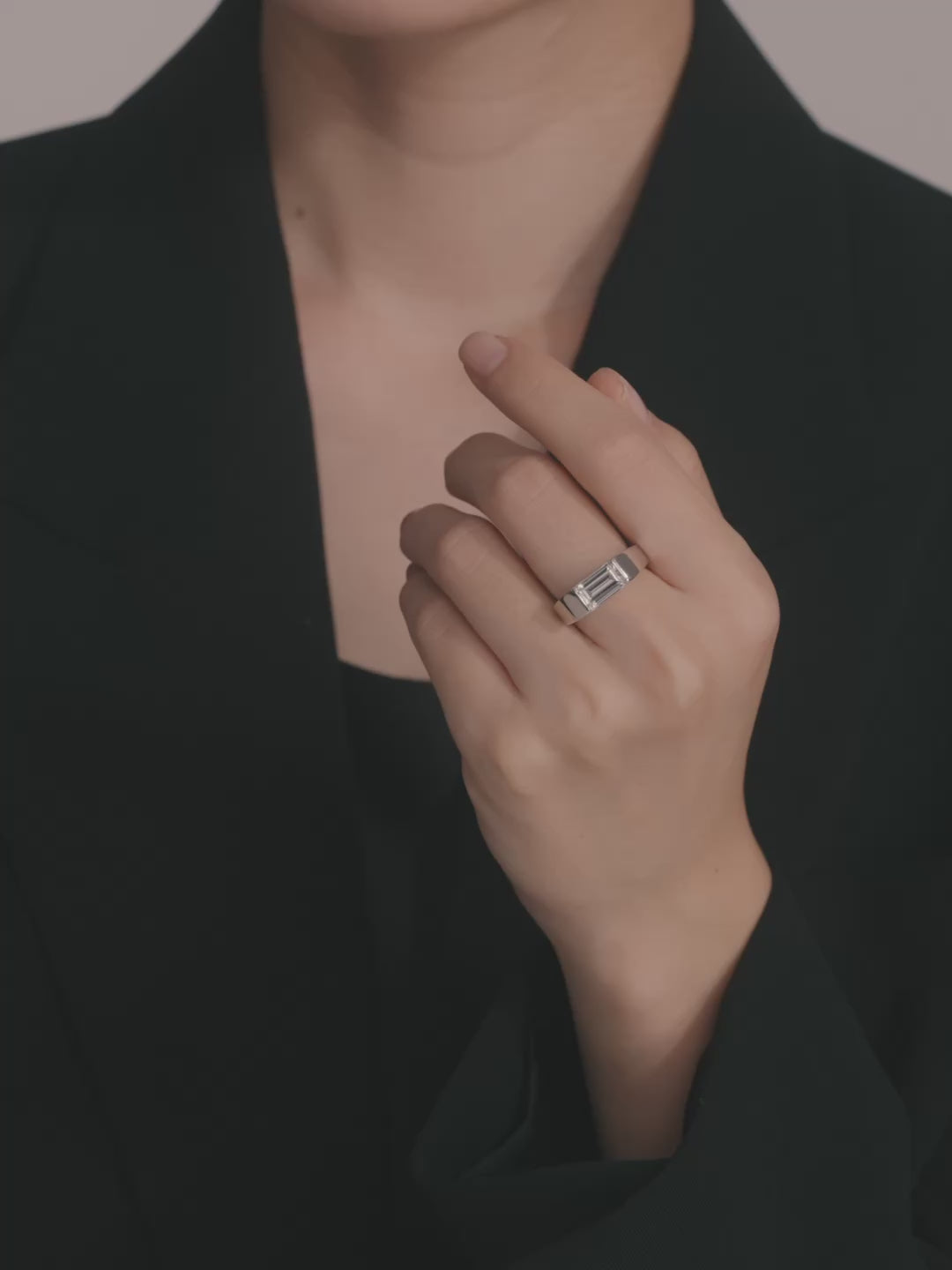 エメラルドカットを包み込むように仕立てたホールドリング。
