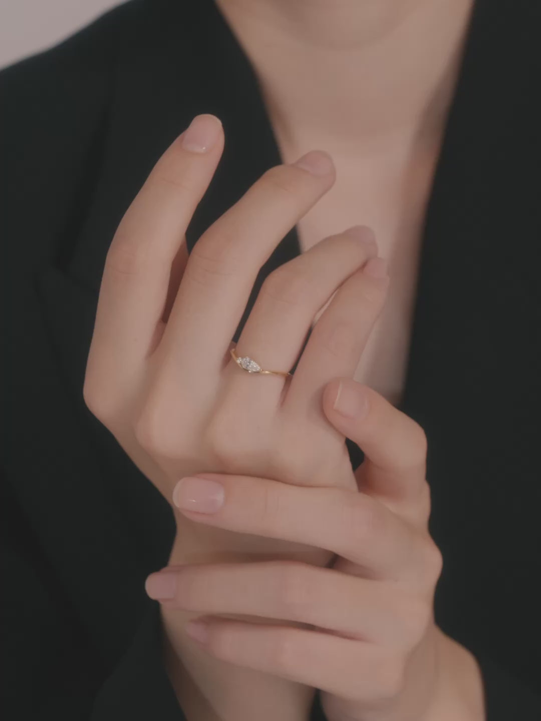 細く繊細なボディが、指先に女性らしい気品を与えてくれます。雫のようなペアシェイプのストーンの横には、寄り添うようにラウンドカットを配置。それぞれの光が、手元にやさしく瞬きます。