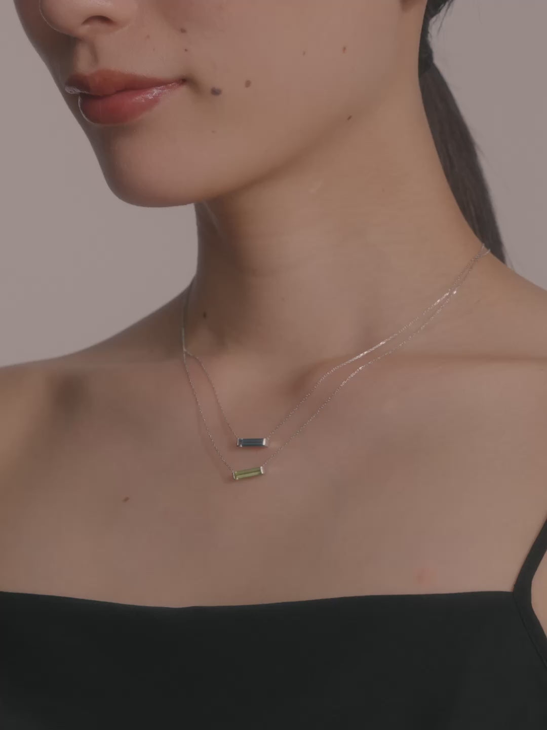 やわらかなグリーンの光を帯びた天然石のペリドットを、水平にセッティングしたホリゾンタルネックレス。