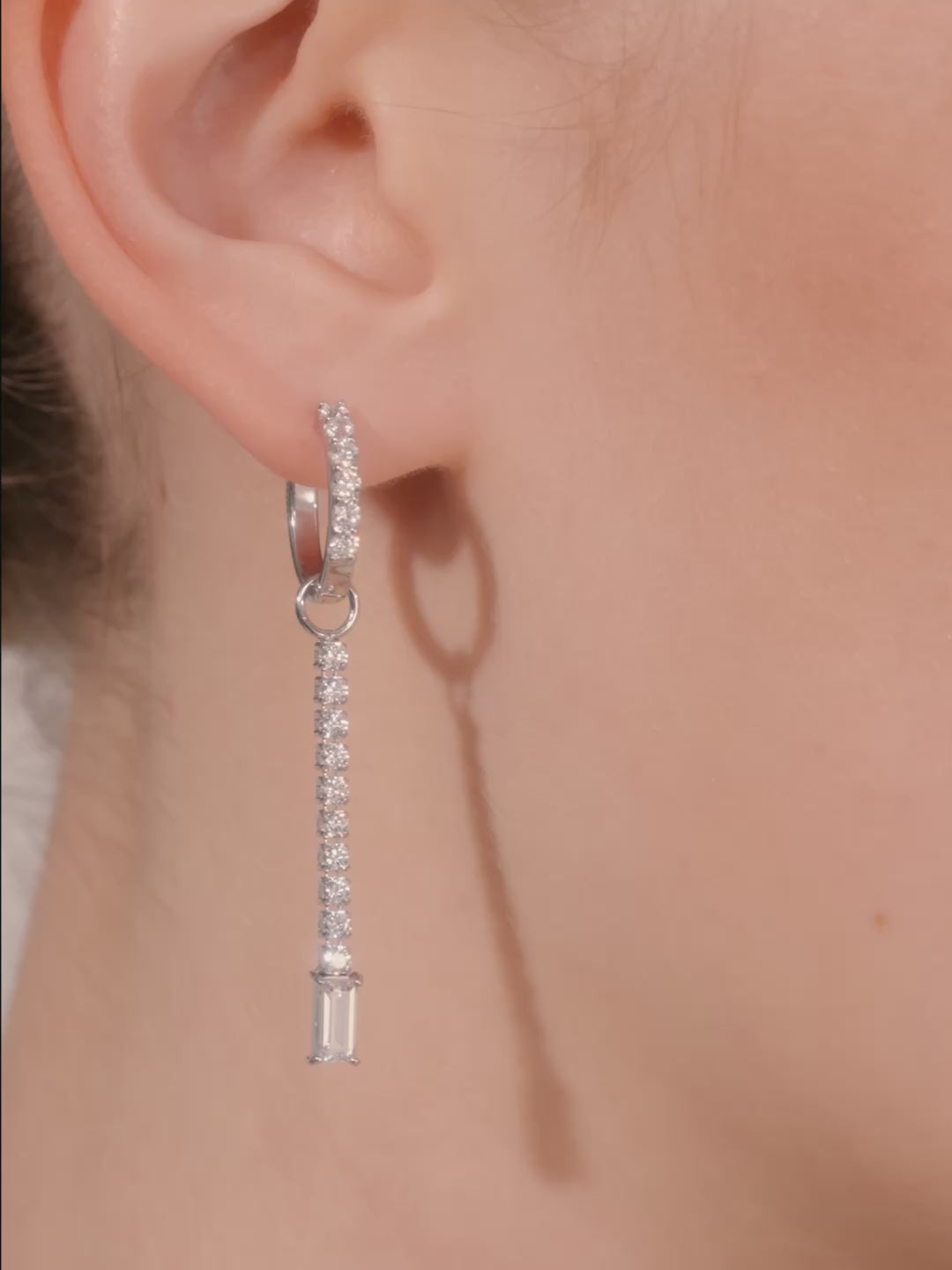 絹のように滑らかな「Silk chain」をつけた状態では、先端の四角いバゲットカットが印象的に輝きます。