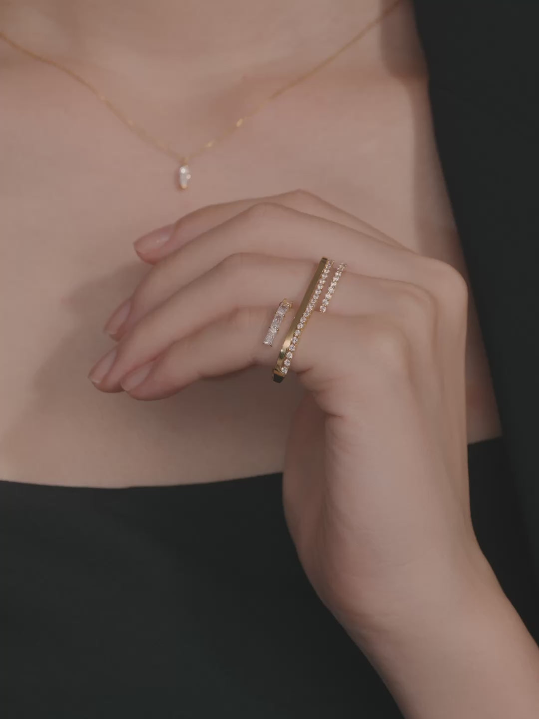 ゴールドカラーは、二本の指に渡るフォルムを、艶のあるエレガントな印象に仕上げます。