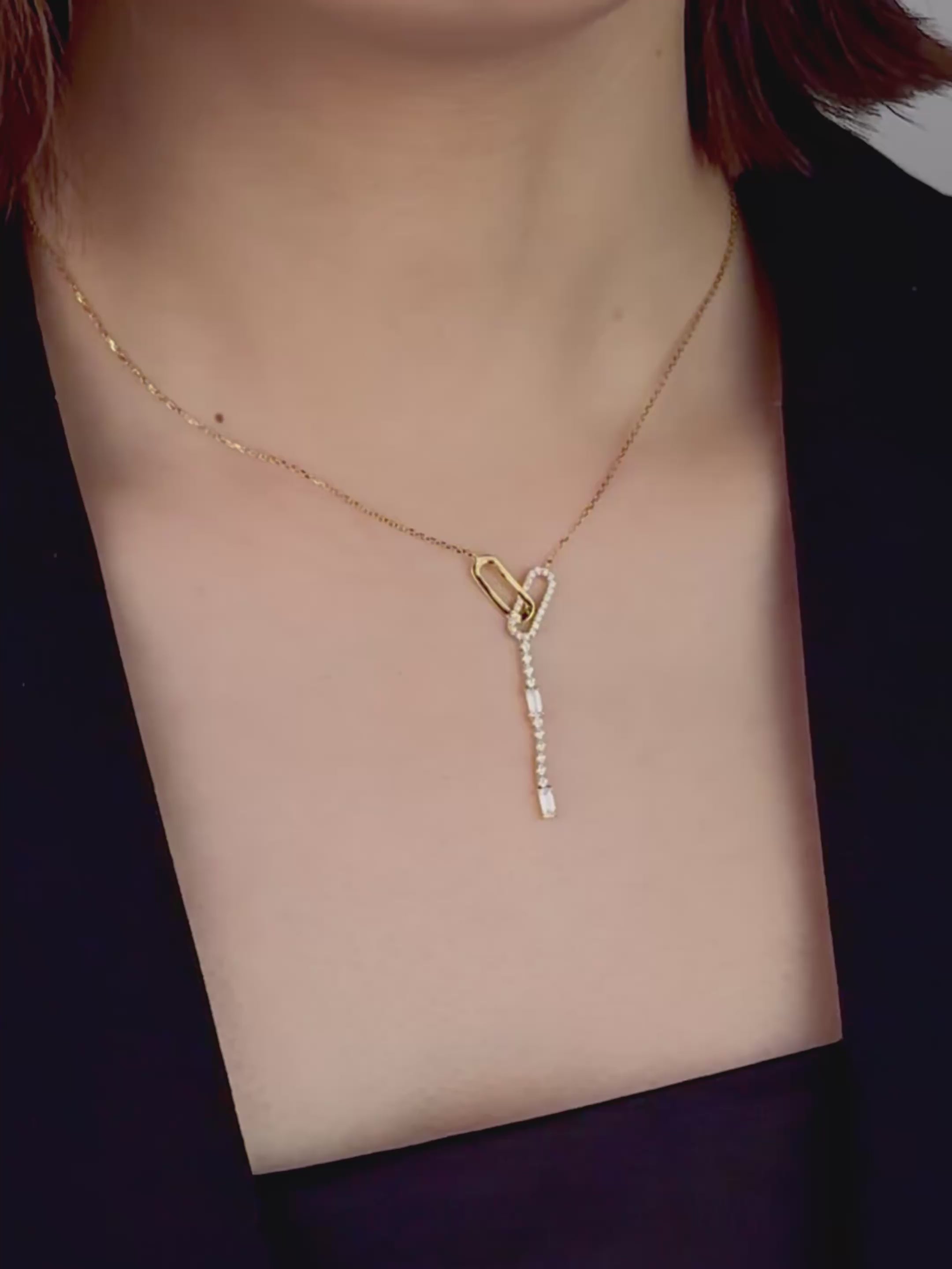ゴールドカラーの艶が、バゲットカットの直線的な光と、オーバルリンクの柔らかな陰影を引き立て、胸元に品のある印象をもたらします。