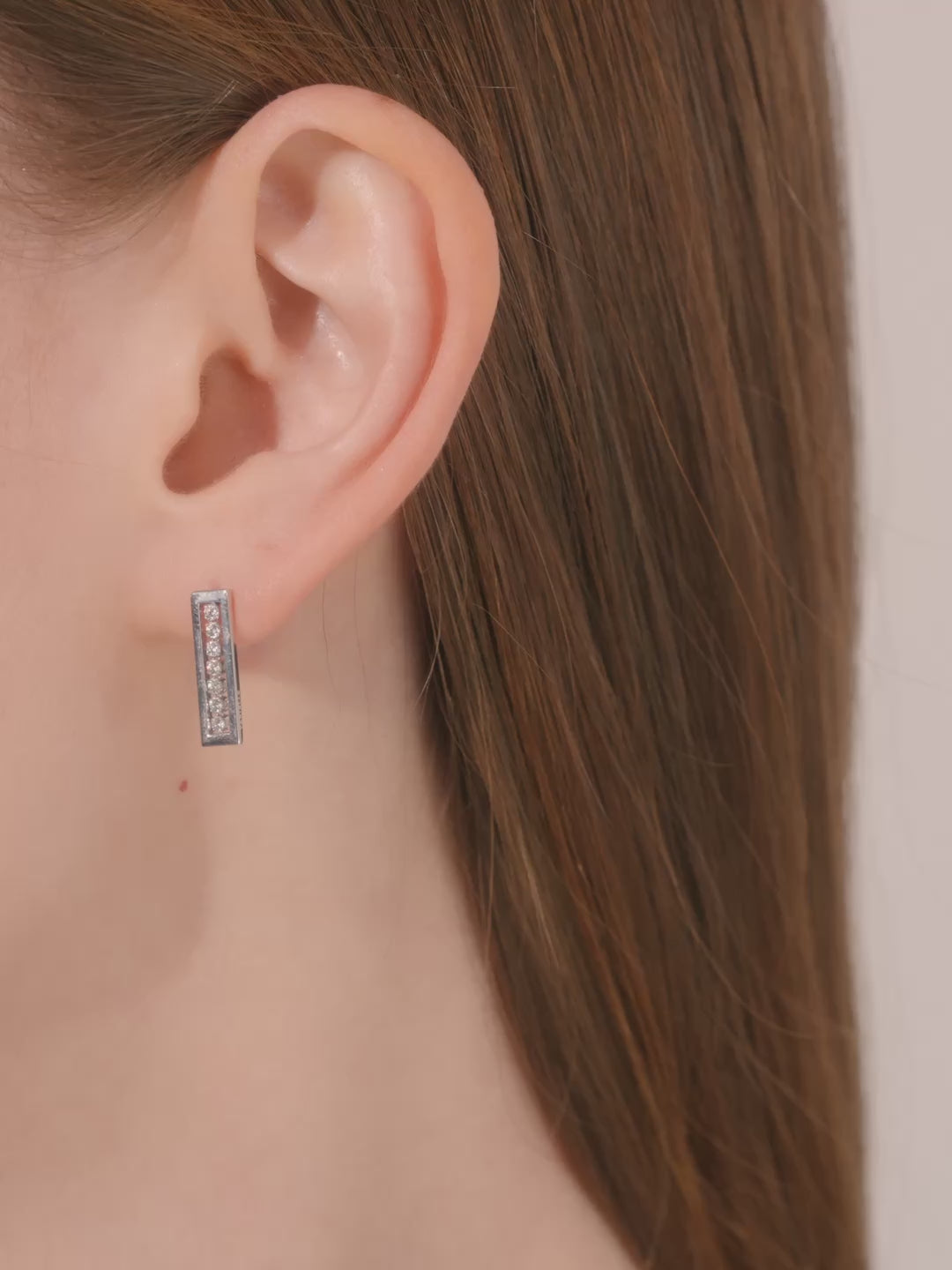 細やかな輝きを放つ「Silk chain」を、直線的なフレームに収めたピアス。