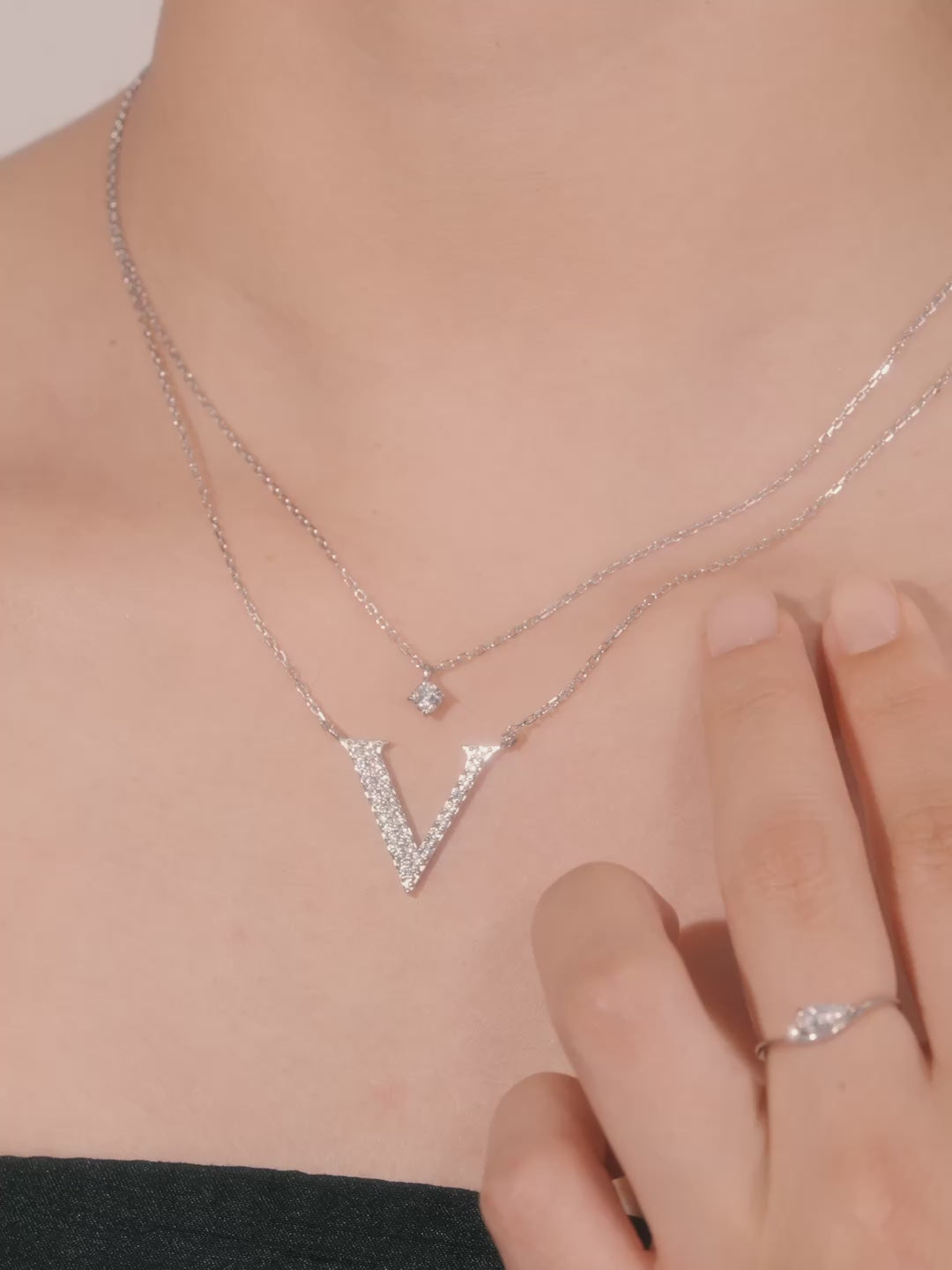 十字の光を生み出す「クロスフォーカット」のきらめきが胸元に立体的な輝きを添え、「V」のシャープなラインと華奢なチェーンが首元をすっきりと美しく見せてくれます。